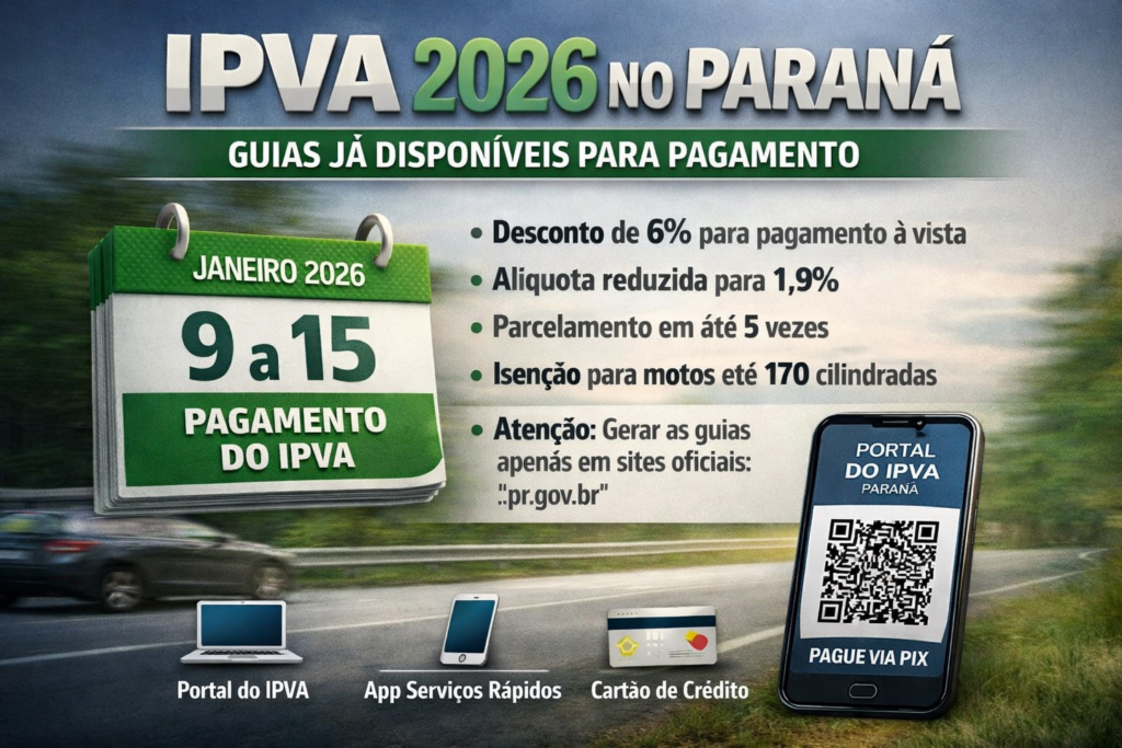 - Início de Janeiro de 2026: Consulte o site da Secretaria da Fazenda do Paraná (SEFA/PR) ou do Detran para verificar o valor exato, as datas de vencimento e emitir a guia de pagamento.
